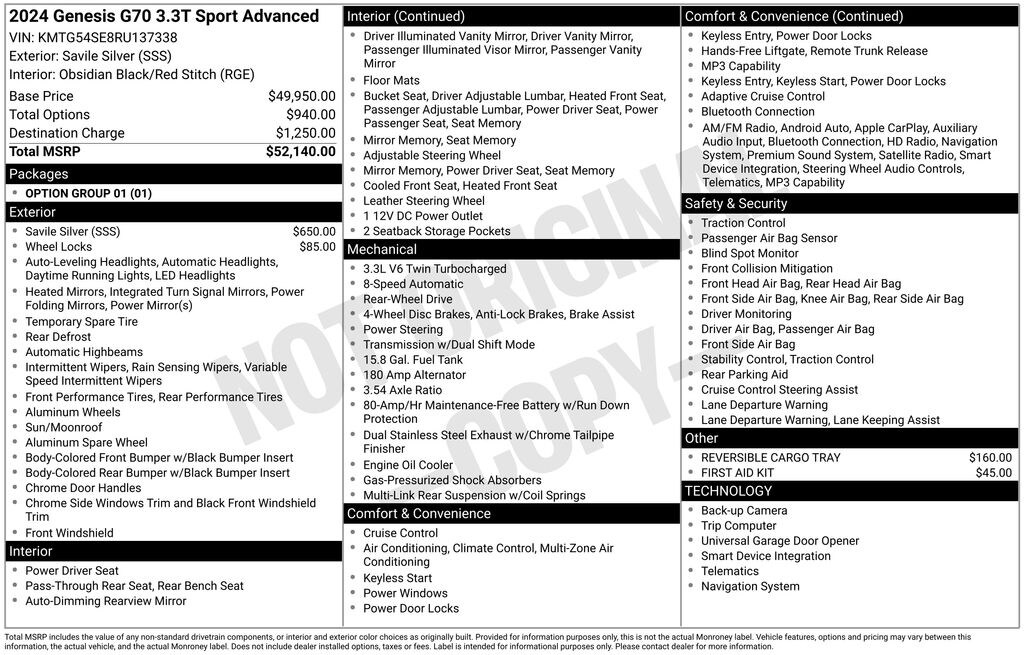 2024 Genesis G70 3.3T Sport Advanced 3.3L V6 DGI DOHC 24V 8-Speed Automatic RWD 3.3T Sport Advanced