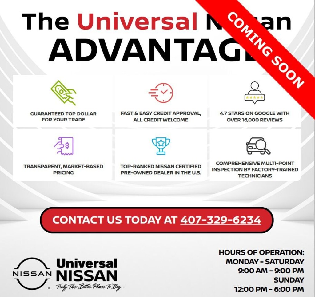 Find confidence and value in your next pre-owned vehicle at Universal Nissan, Hyundai and Genesis, Central Floridaâs trusted source for quality used cars. We make the process simple with transparent pricing, fast and flexible financing, and a team committed to a no-pressure, hassle-free experience. Backed by more than 16,000 Google reviews and a 4.7-star rating, our reputation for honesty and service speaks for itself. Every used vehicle is carefully inspected and professionally reconditioned by our factory-trained technicians to ensure reliability and long-term peace of mind. For added confidence, every transaction includes both a free CarFax and AutoCheck report, giving you full transparency on your vehicleâs history. As one of the Top-Ranked Certified Pre-Owned Dealers in the nation, we stand behind what we sell with confidence and care. Discover an award-winning dealership recognized for customer satisfaction, sales excellence, and owner loyalty. Disclaimer: All vehicle pricing reflects current market values and available dealer programs for ZIP 32837. Pricing excludes dealer fee of $1,198, electronic filing fee of $549, reconditioning fee, tax, tag, and title. Offers cannot be combined and are not valid on prior purchases. Prices and availability are subject to change without notice.
