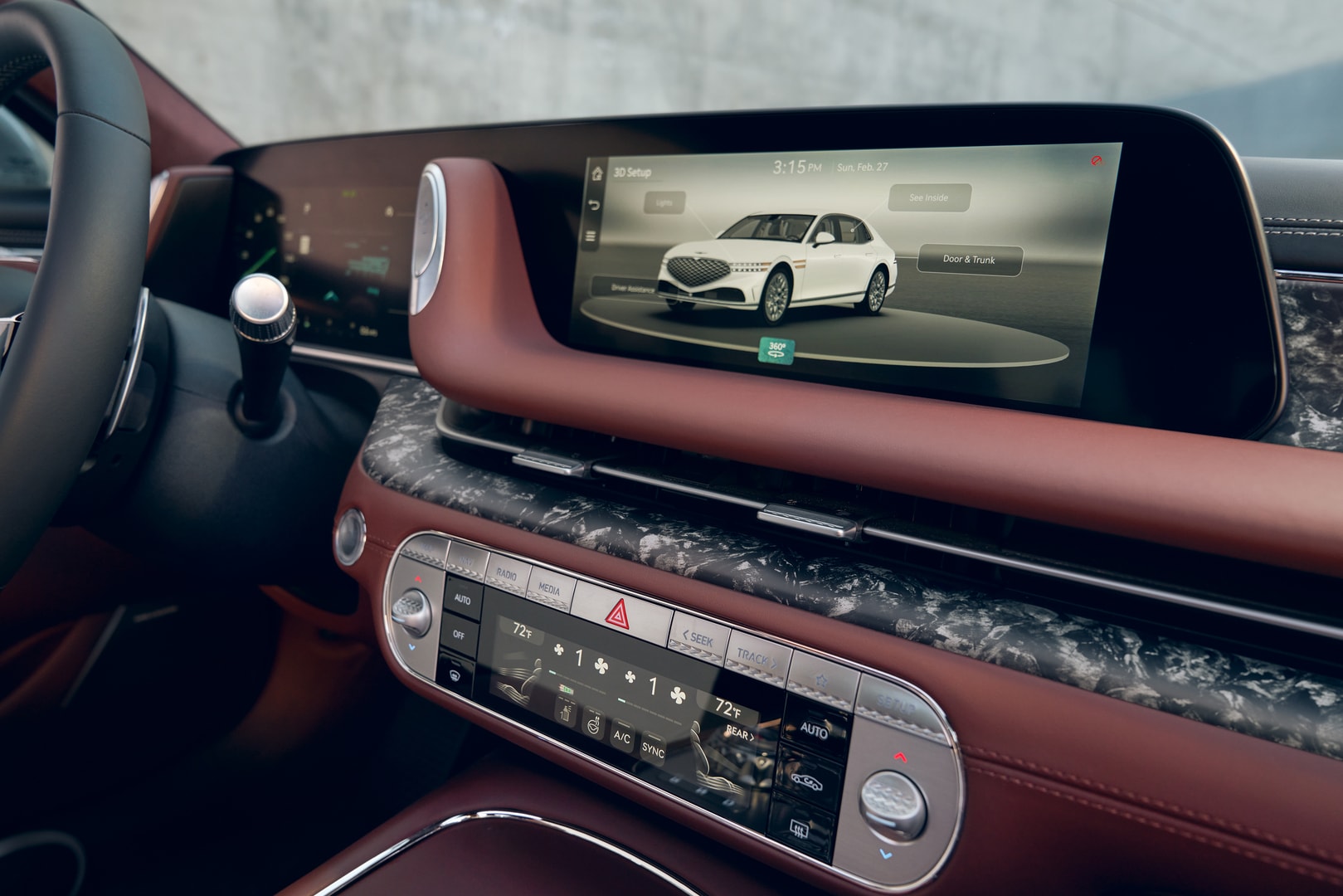 Two 12.3-inch front screens anchor the G90 infotainment system. One screen is a touchscreen display, while the other is a digital instrument cluster. Integrated navigation ensures you always reach your destination efficiently. A 15-speaker Bang & Olufsen premium audio system is standard, while a 26-speaker B&O system is available. Standard safety features include forward collision warning, automatic emergency braking, lane-keeping assistance, adaptive cruise control, a blind-spot view monitor, blind spot intervention, rear automatic braking, automatic high beams, parking sensors, and more.