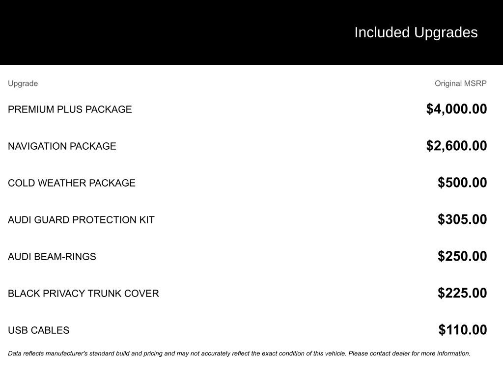 ⢠Premium Plus Package: Includes Audi Connect CARE, Audi Side Assist, Rear Cross Traffic Assist, Heated Auto-Dimming & Power-Adjustable Mirrors, Parking System Plus, and more