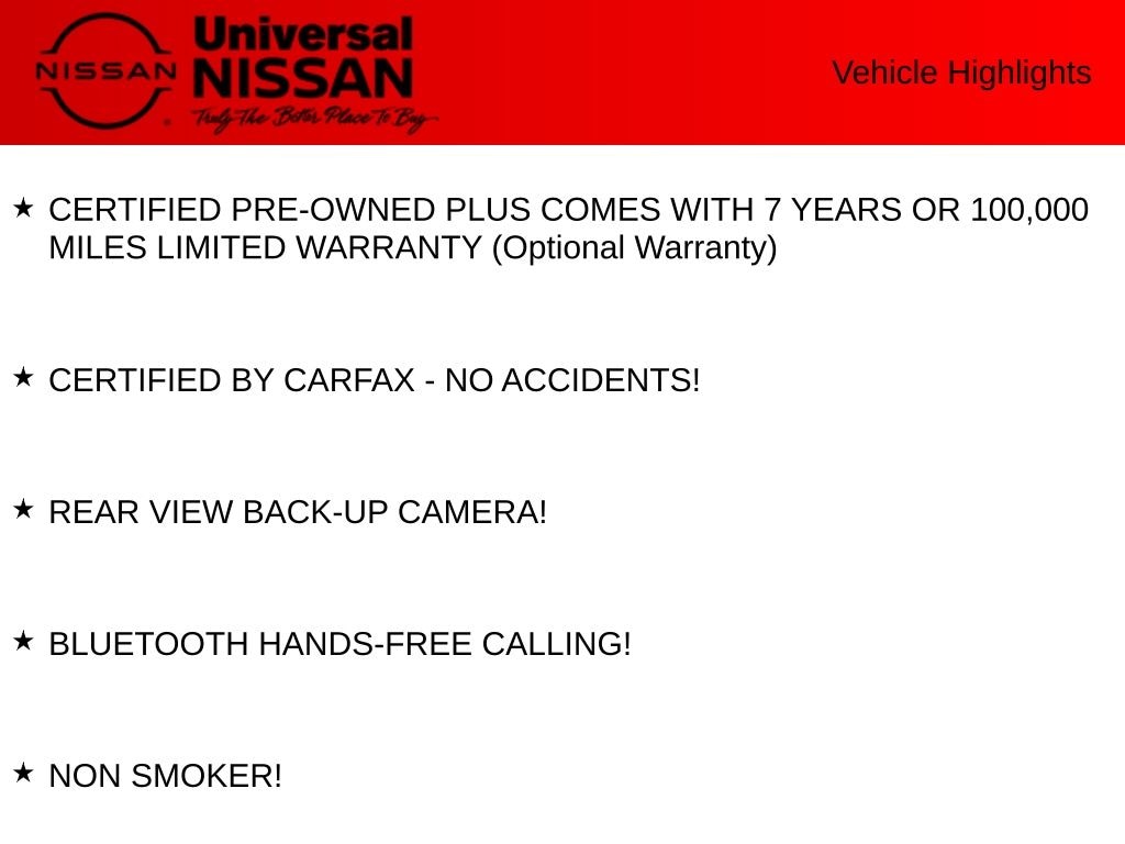 - CERTIFIED PRE-OWNED PLUS COMES WITH 7 YEARS OR 100000 MILES LIMITED WARRANTY (Optional Warranty)