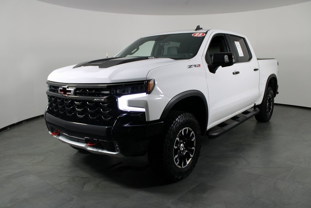 2023 Chevrolet Silverado 1500 ZR2 EcoTec3 6.2L V8 10-Speed Automatic 4WD ZR2 Odometer is 9085 miles below market average! CERTIFIED BY CARFAX - NO ACCIDENTS!, REAR VIEW BACK-UP CAMERA!, BLUETOOTH HANDS-FREE CALLING!, HEATED SEATS!, LEATHER SEATS!, NON SMOKER!, Silverado 1500 ZR2, 4D Crew Cab, EcoTec3 6.2L V8, 10-Speed Automatic, 4WD, Summit White, Jet Black/Graystone w/Perforated Leather Seat Trim.