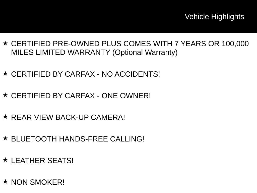 ⢠CERTIFIED PRE-OWNED PLUS COMES WITH 7 YEARS OR 100,000 MILES LIMITED WARRANTY (Optional Warranty)
