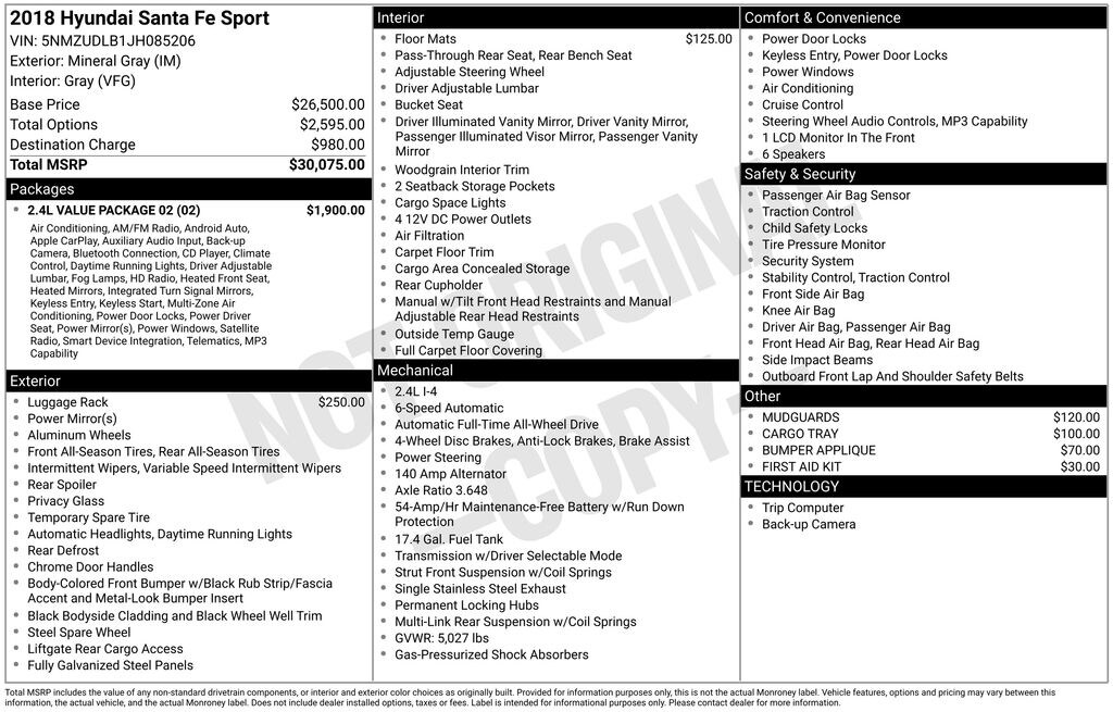 Under the hood, you'll find a powerful 2.4L I4 DGI DOHC 16V engine paired with a smooth-shifting 6-Speed Automatic with Shiftronic transmission, delivering an impressive 20 city/26 highway MPG. The advanced all-wheel-drive system provides confident handling and traction in all weather conditions, making this Santa Fe Sport an ideal companion for your daily commute or weekend adventures.