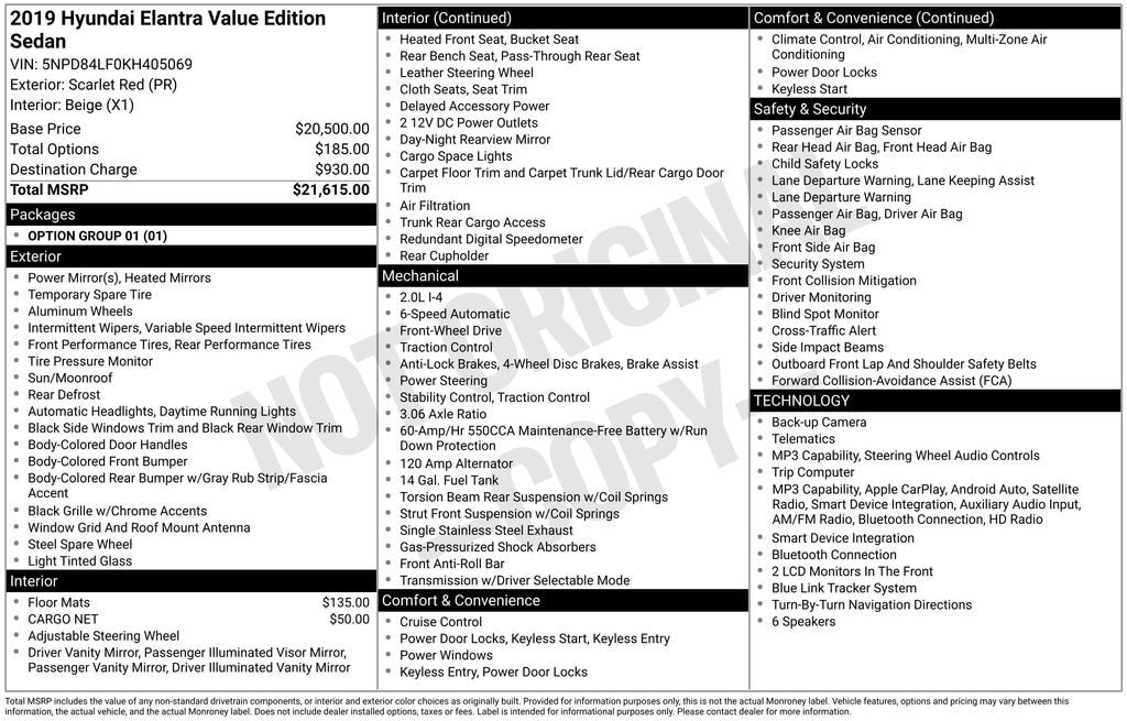 The Elantra's sleek, modern design is complemented by a host of advanced safety features, including Electronic Stability Control, Traction Control, and a Rearview Camera, giving you peace of mind on the road. With its spacious interior, generous cargo capacity, and impressive fuel efficiency, the 2019 Hyundai Elantra Value Edition is the complete package.