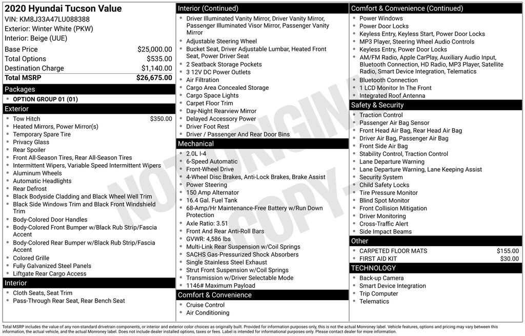 Step inside and experience the well-appointed interior, featuring a wealth of premium amenities. Enjoy the convenience of remote keyless entry, power windows, and steering wheel-mounted audio controls. Stay connected with the AM/FM/SiriusXM audio system and seamlessly integrate your smartphone using Apple CarPlay and Android Auto. The spacious cabin with split-folding rear seats offers ample room for passengers and cargo, making this Tucson an ideal companion for your daily commute or weekend adventures.