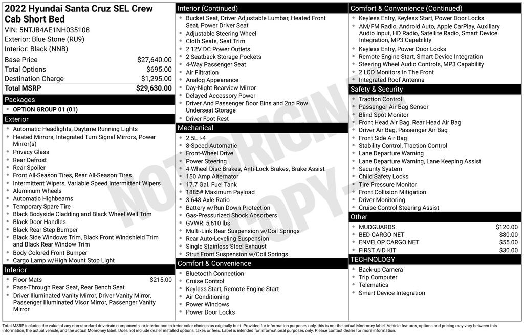 Experience the convenience of cutting-edge technology, including Apple CarPlay and Android Auto integration, a rearview camera, and a premium audio system with SiriusXM radio. The Santa Cruz also boasts a host of comfort and convenience features, such as power windows, power door locks, and a power driver's seat, ensuring a truly exceptional driving experience.