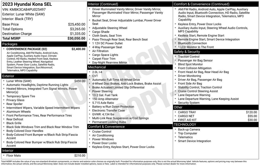 Elevate your driving experience with this 2023 Hyundai Kona SEL. This factory certified pre-owned vehicle offers a compelling blend of style, capability, and convenience, making it an exceptional choice for the discerning buyer.