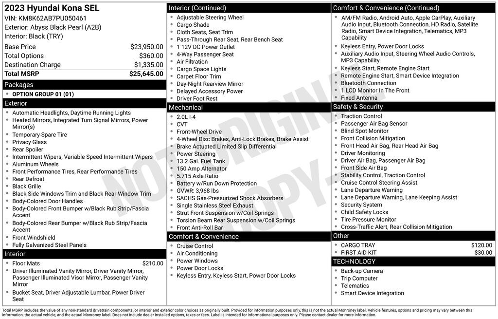 Discover the exceptional 2023 Hyundai Kona SEL, a versatile and stylish crossover that's ready to elevate your driving experience. With its sleek black exterior and a powerful 2.0L I4 DOHC Dual CVVT engine, this Kona delivers an impressive balance of performance and efficiency, achieving an EPA-estimated 30 city / 35 highway MPG.