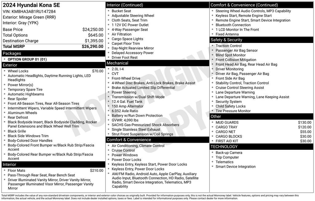 The 2024 Hyundai Kona SE offers a well-rounded package that caters to your active lifestyle. Imagine the versatility of the Split Folding Rear Seat, the added protection of the Mud Guards, and the convenience of the Cargo Tray and Cargo Blocks. Whether you're running errands, embarking on a weekend getaway, or navigating the daily commute, this Kona is ready to adapt to your needs.