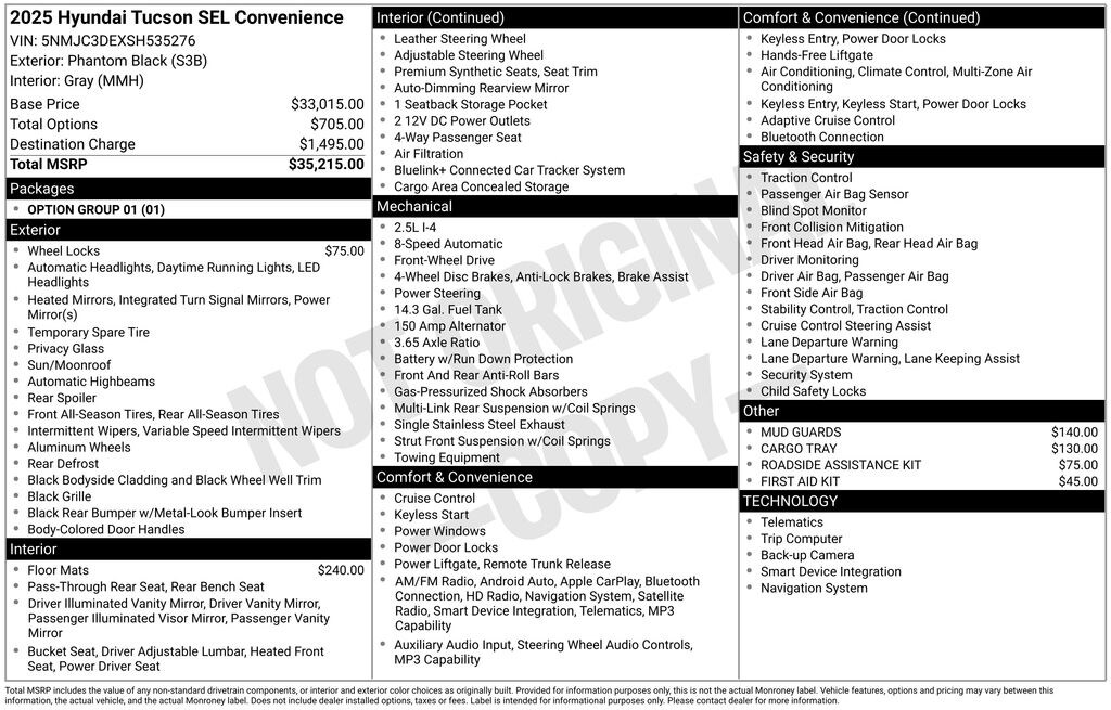 2025 Hyundai Tucson SEL Convenience 2.5L I4 DGI DOHC 16V LEV3-SULEV30 187hp 8-Speed Automatic with SHIFTRONIC FWD SEL Convenience