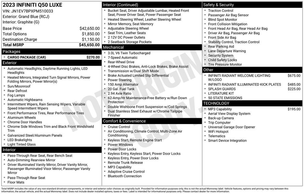 2023 INFINITI Q50 LUXE 3.0L V6 7-Speed Automatic with Overdrive RWD LUXE Odometer is 545 miles below market average!