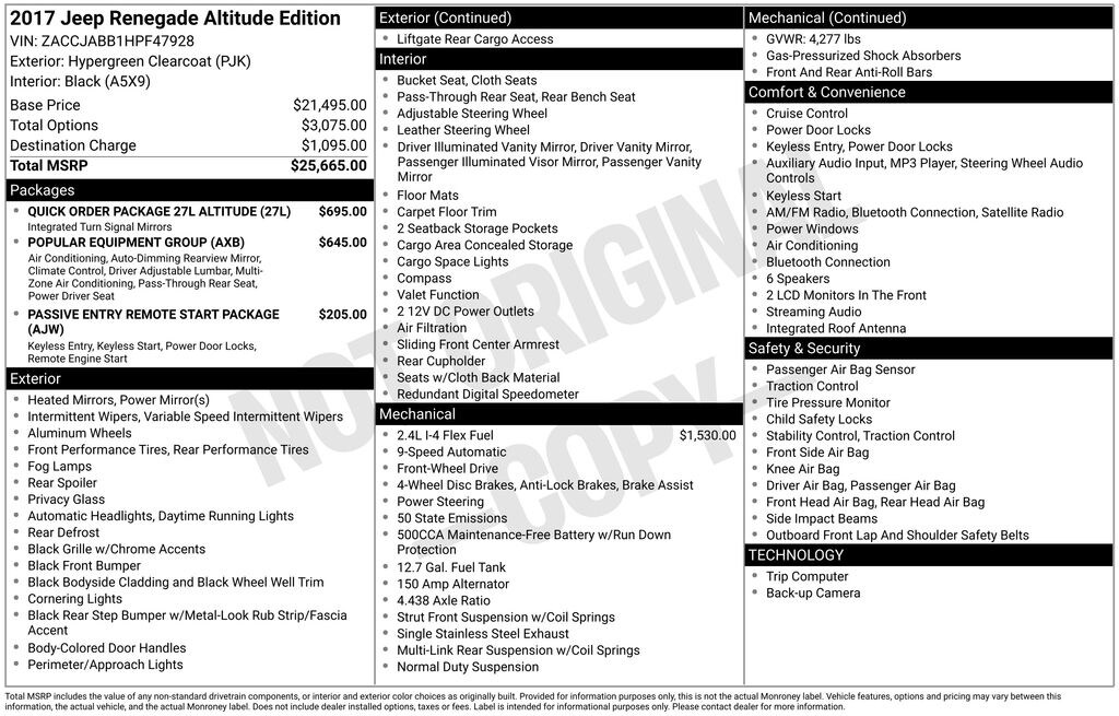 Safety is paramount in the 2017 Jeep Renegade Altitude, with features like Electronic Stability Control, Traction Control, and a ParkView Rear Back-Up Camera to give you peace of mind on the road.