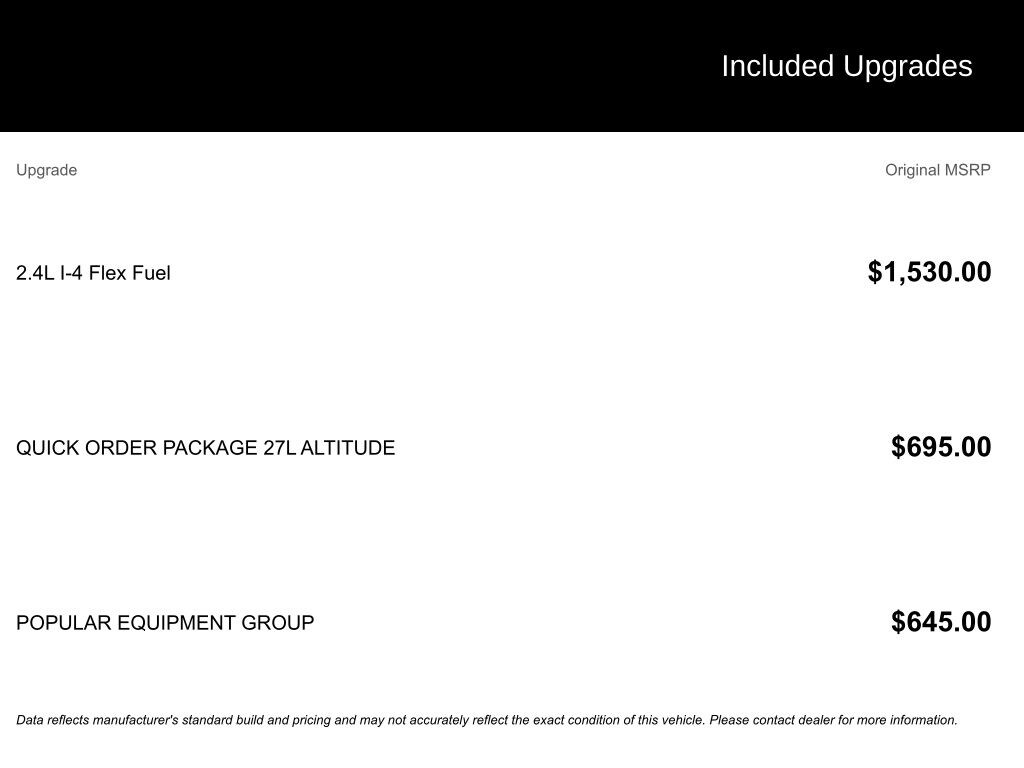 The Altitude Package adds a touch of sophistication with its Gloss Black accents, including the Day Light Opening Moldings, Fascia Applique, and Badging. The Passive Entry Remote Start Package provides the convenience of keyless entry and remote engine start, while the Popular Equipment Group enhances your comfort with features like Dual-Zone Automatic Climate Control, Power Driver's Seat, and an Auto-Dimming Rearview Mirror.