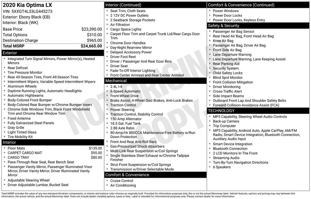 Discover the perfect balance of style, performance, and value with the 2020 Kia Optima LX. Experience the difference for yourself by scheduling a test drive at our showroom today. We're confident that once you get behind the wheel, you'll be convinced that this Optima is the ideal choice for your next vehicle.