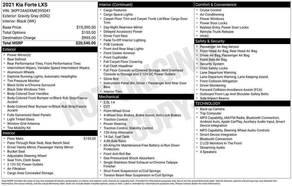 Designed with the modern driver in mind, the 2021 Kia Forte LXS delivers a exceptional blend of style, technology, and efficiency. Experience the difference for yourself and schedule a test drive today. We're confident you'll be impressed by the Forte's exceptional value and uncompromising quality.