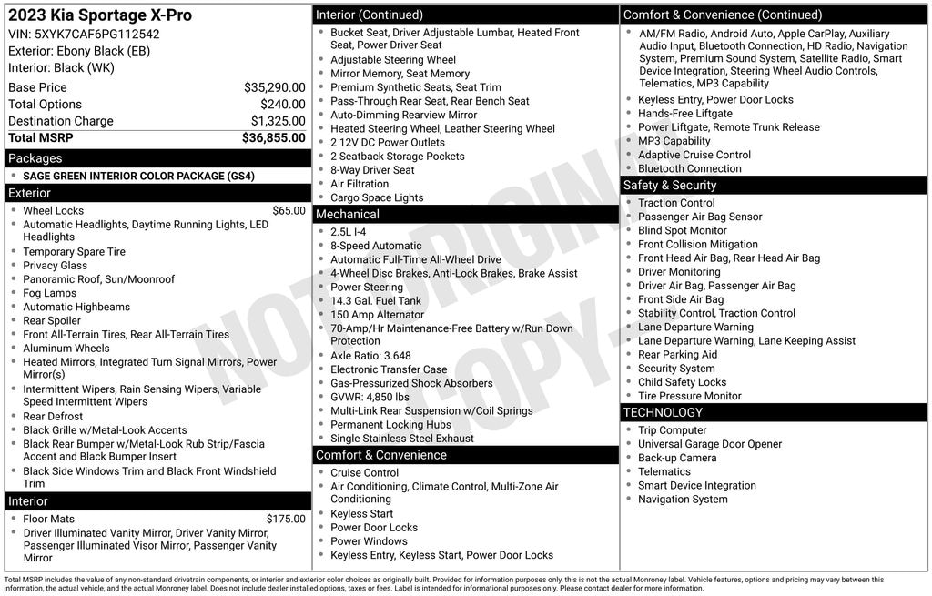 Discover the perfect balance of style and substance in the 2023 Kia Sportage X-Pro. This meticulously crafted SUV boasts a striking exterior design, highlighted by its bold front grille, sleek lines, and striking 17-inch matte black alloy wheels. Step inside and you'll be greeted by a premium, spacious cabin that caters to your every need, with features like heated front seats, a heated steering wheel, and a premium Leatherette upholstery.