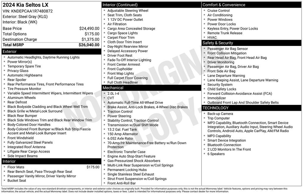 Under the hood, the 2.0L I4 MPI engine and CVT transmission deliver a smooth and efficient performance, with an impressive EPA-estimated 27 city/31 highway MPG rating. The standard all-wheel-drive system ensures confident handling in a variety of road conditions, making this Seltos LX a practical choice for your everyday adventures.