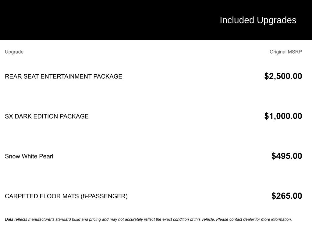 ⢠SX Dark Edition Package: Elevate your presence with the sophisticated Dark Edition styling, including 19-inch Alloy Dark Edition wheels, a distinctive Dark Edition front grille, and sleek Dark Edition mirror caps.