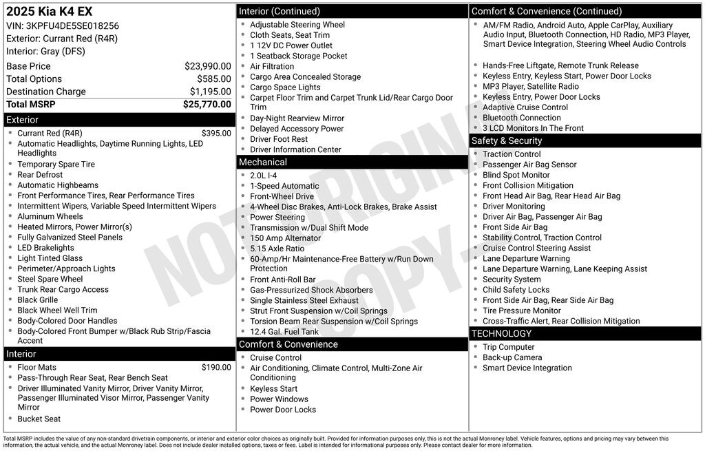 Under the hood, the 2.0L I4 MPI engine, paired with a smooth-shifting CVT transmission, delivers a responsive and efficient driving experience. With an impressive EPA-estimated 29 mpg in the city and 39 mpg on the highway, this Kia K4 EX offers exceptional fuel economy, making it an ideal choice for your daily commute or weekend getaways.