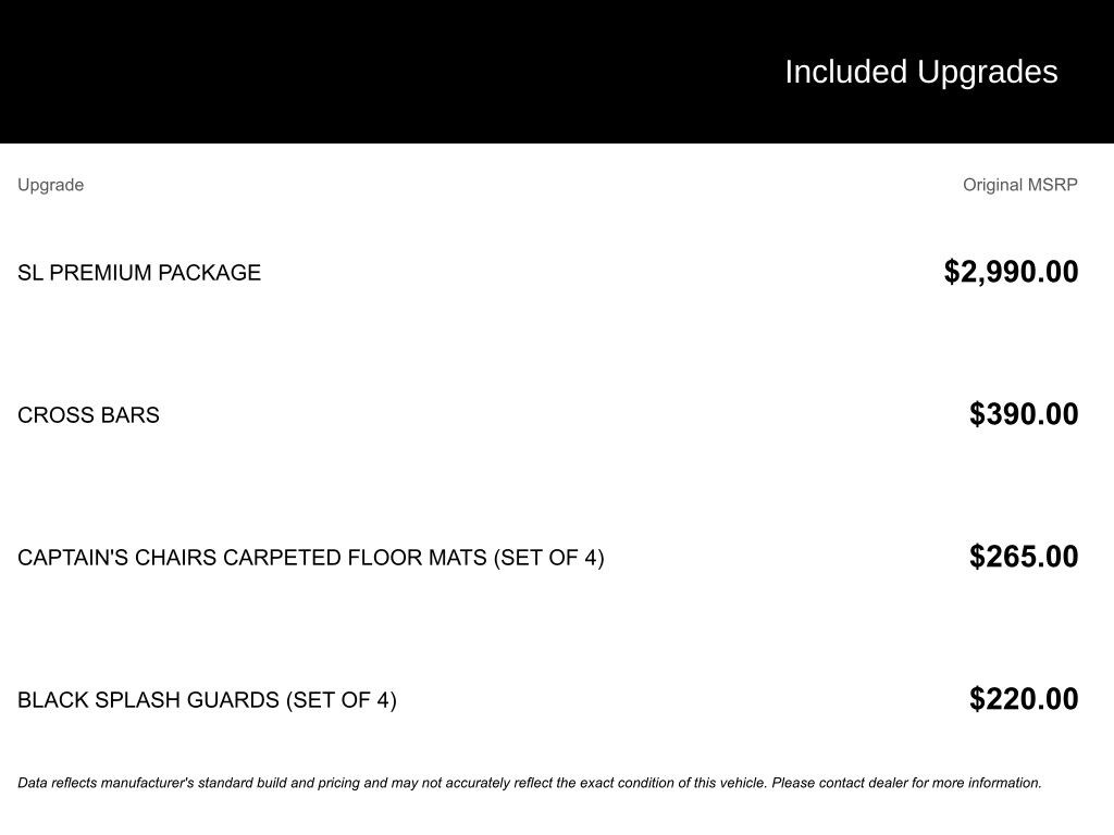 - SL Premium Package: Bose Premium Audio System, 13 speakers w/dual driver subwoofer, 20" Painted Alloy Wheels, Panoramic Moonroof, Heated Rear Seats, Tow Hitch Receiver & Harness, 2nd-Row Captain Chairs, 2nd-Row Removable Center Console