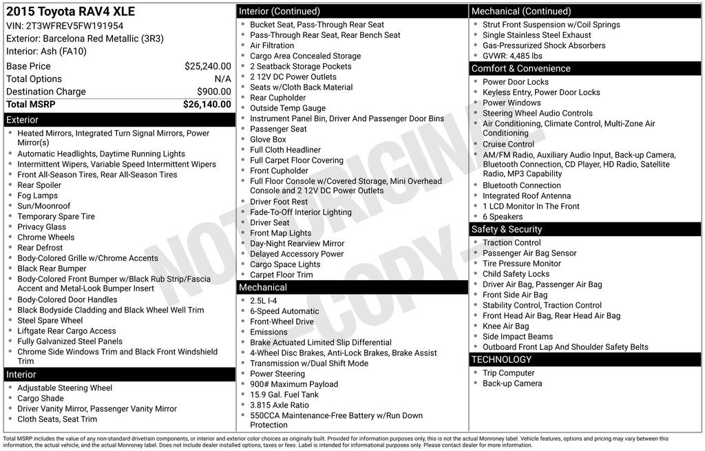 2015 Toyota RAV4 XLE 2.5L 4-Cylinder DOHC Dual VVT-i 6-Speed Automatic FWD XLE ABS brakes, Alloy wheels, Electronic Stability Control, Front dual zone A/C, Heated door mirrors, Illuminated entry, Low tire pressure warning, Power moonroof, Remote keyless entry, Traction control.