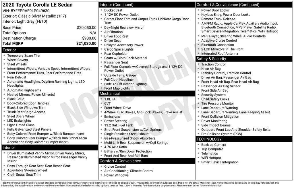 2020 Toyota Corolla LE 1.8L I4 DOHC 16V CVT FWD LE