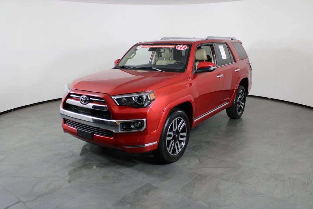 2021 Toyota 4Runner Limited 4.0L V6 SMPI DOHC 5-Speed Automatic with Overdrive 4WD Limited Odometer is 19503 miles below market average! CERTIFIED PRE-OWNED PLUS COMES WITH 7 YEARS OR 100,000 MILES LIMITED WARRANTY (Optional Warranty), CERTIFIED BY CARFAX - NO ACCIDENTS!, REAR VIEW BACK-UP CAMERA!, BLUETOOTH HANDS-FREE CALLING!, NAVIGATION/GPS!, HEATED SEATS!, LEATHER SEATS!, NON SMOKER!, BLIND SPOT TECHNOLOGY - NEVER WORRY WHEN CHANGING LANES AGAIN!!, LANE DEPARTURE ASSIST!, 4Runner Limited, 4D Sport Utility, 4.0L V6 SMPI DOHC, 5-Speed Automatic with Overdrive, 4WD, Barcelona Red Metallic, Black/Graphite w/Leather Seat Trim.