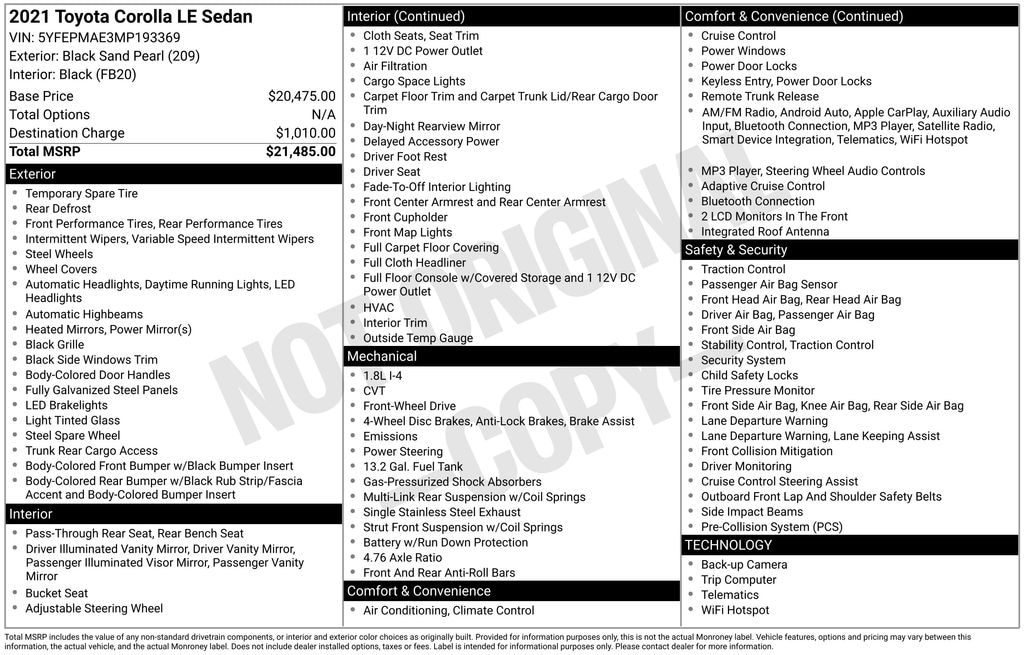 Whether you're commuting, running errands, or embarking on a road trip, this 2021 Toyota Corolla LE is the perfect companion. Its spacious cabin, ample cargo room, and user-friendly technology ensure a comfortable and convenient driving experience. Plus, with the reliability and durability that Toyota is known for, you can trust this Corolla to be a dependable partner for years to come.