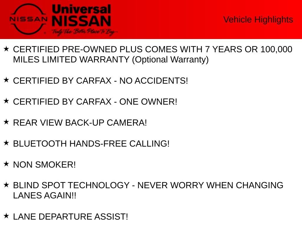 - CERTIFIED PRE-OWNED PLUS COMES WITH 7 YEARS OR 100,000 MILES LIMITED WARRANTY (Optional Warranty)