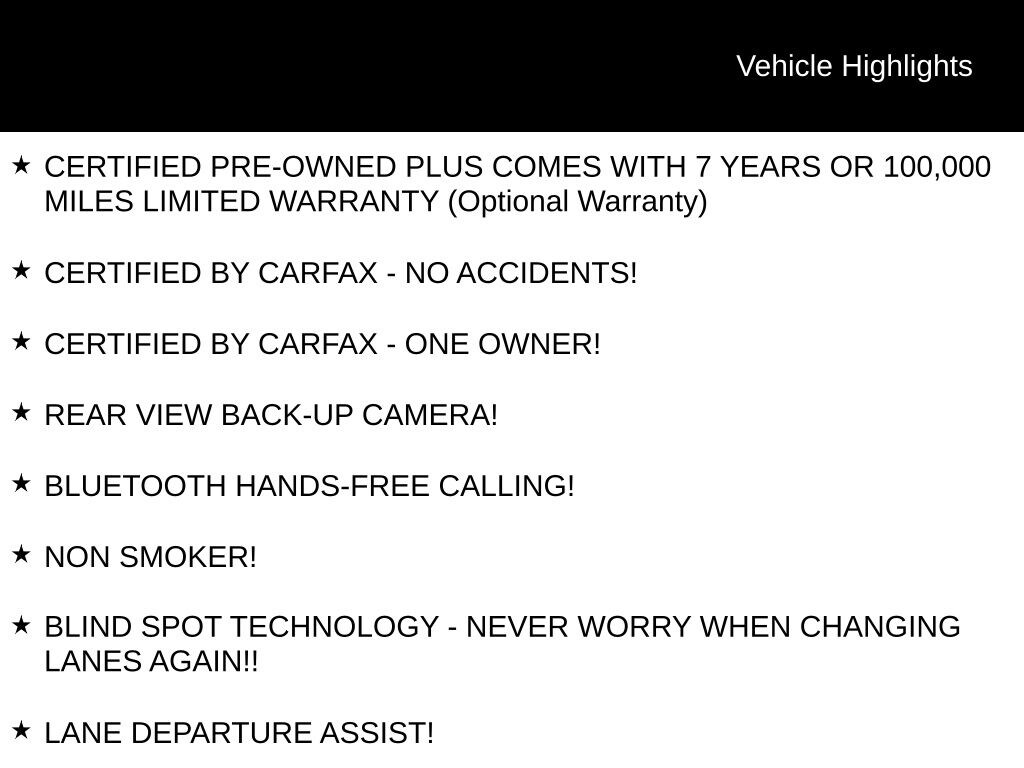- CERTIFIED PRE-OWNED PLUS COMES WITH 7 YEARS OR 100000 MILES LIMITED WARRANTY (Optional Warranty)